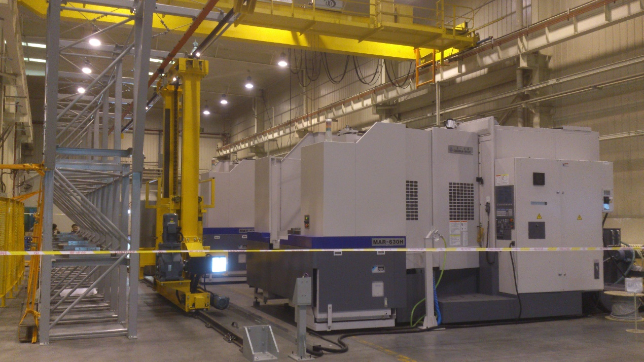 汽車(chē)零部件柔性制造系統(tǒng):本項(xiàng)目由兩臺(tái)臥式加工中心、1個(gè)堆垛機(jī)、1個(gè)立體物料庫(kù)等主要硬件設(shè)備組成。